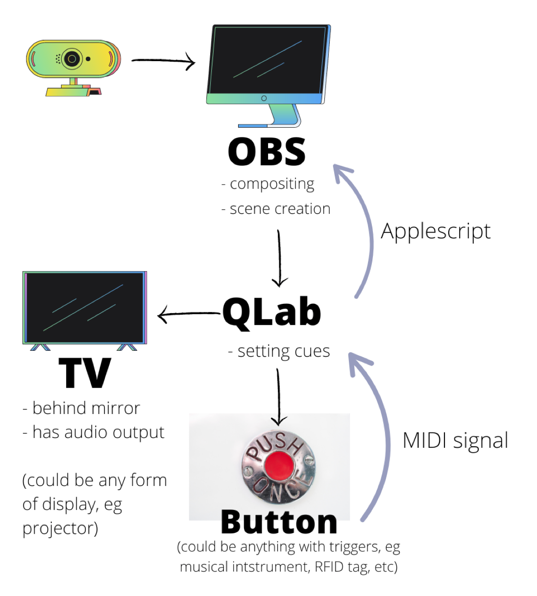 Combining a live webcam feed, pre-rendered animation and sound, and a semi-silvered mirror plasma TV. Takes feed from OBS, into QLab, and sends a MIDI signal to remote.